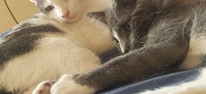 I am now the proud owner of two rambunctious bonded brothers born with little bent tails, who I’ve spent the last week spoiling with holistic cat food, organic rotisserie chicken, more toys on the way, and that cat condo I’ve always wanted. For my cats. >.>’ We’re working on getting them comfortable being held while standing, but for now they crawl into my lap for cuddles, are no longer afraid when the front door opens, and tear around the house chasing and wrestling each other before falling asleep together in a kitty hug. I make them little aluminum foil balls to play with, tossed a blanket on the floor of my closet because I know they like to nap there sometimes, and now have to carefully roll my office chair out because they like to hang out under there while I’m sitting in it at my computer.