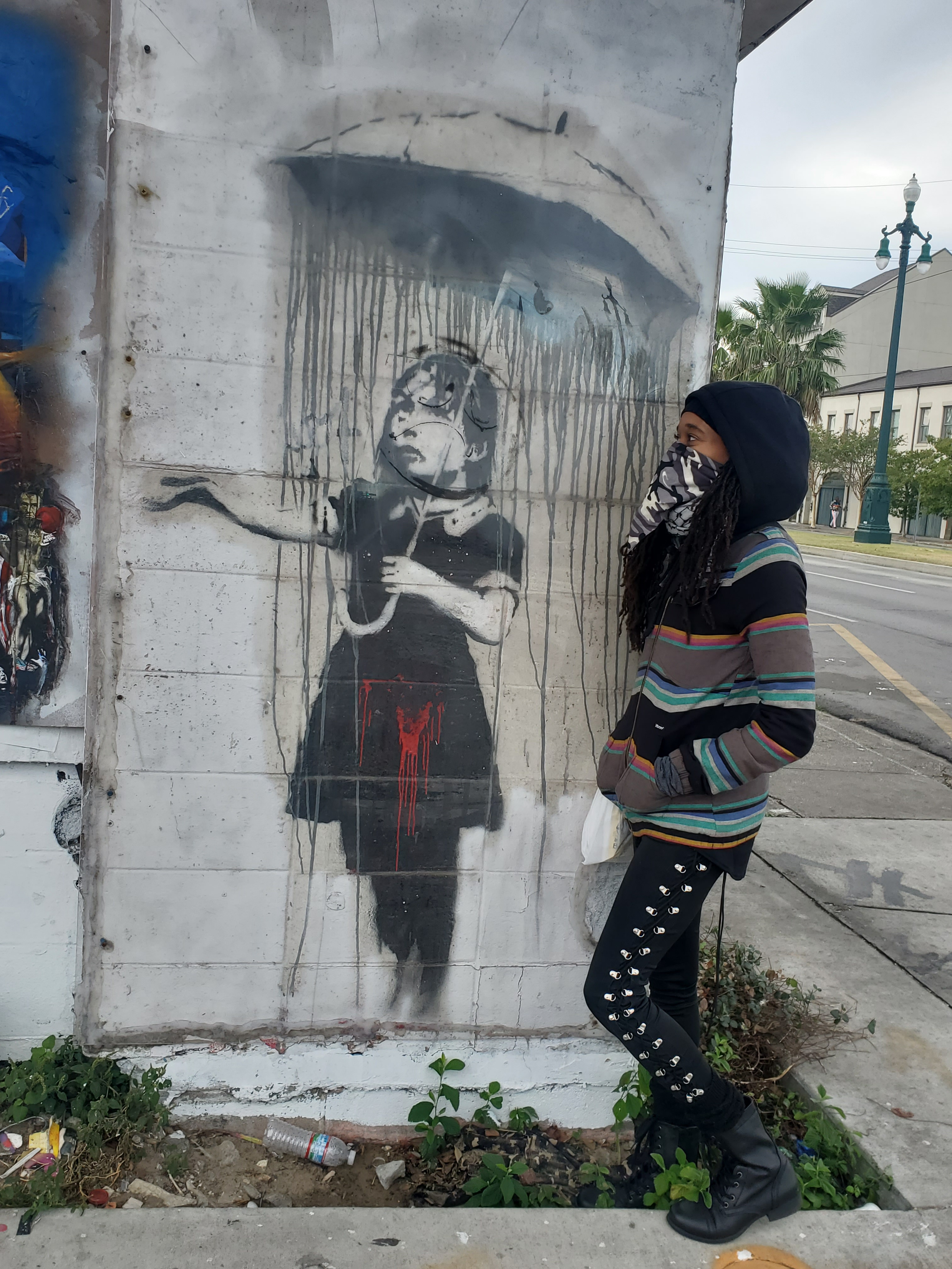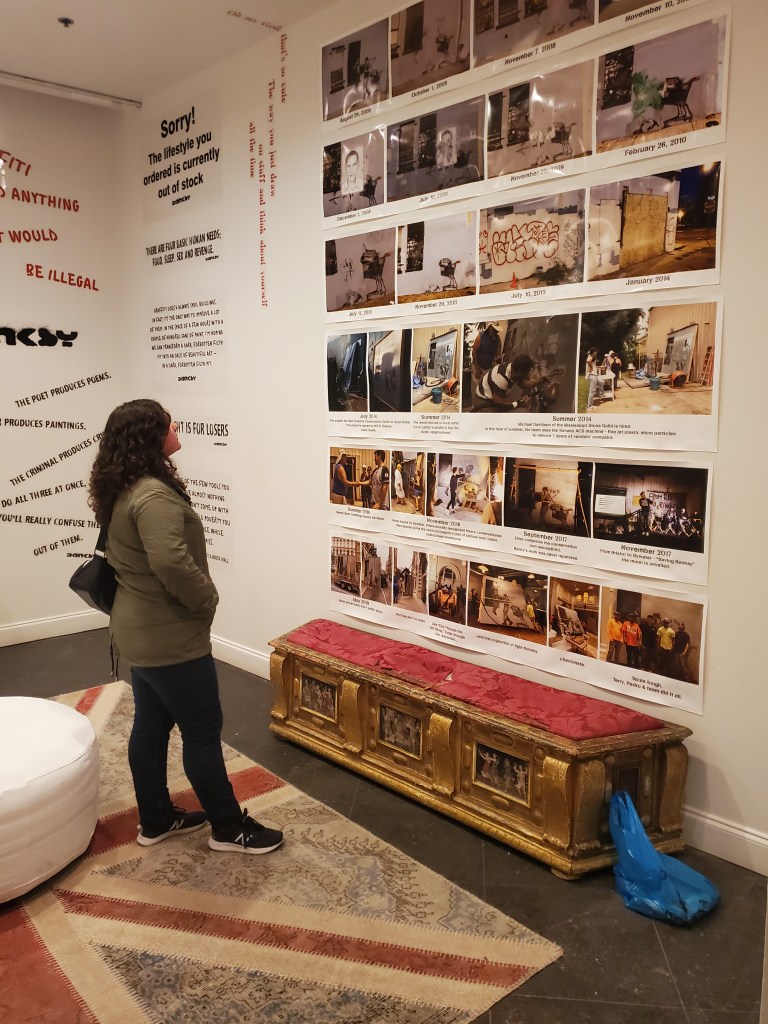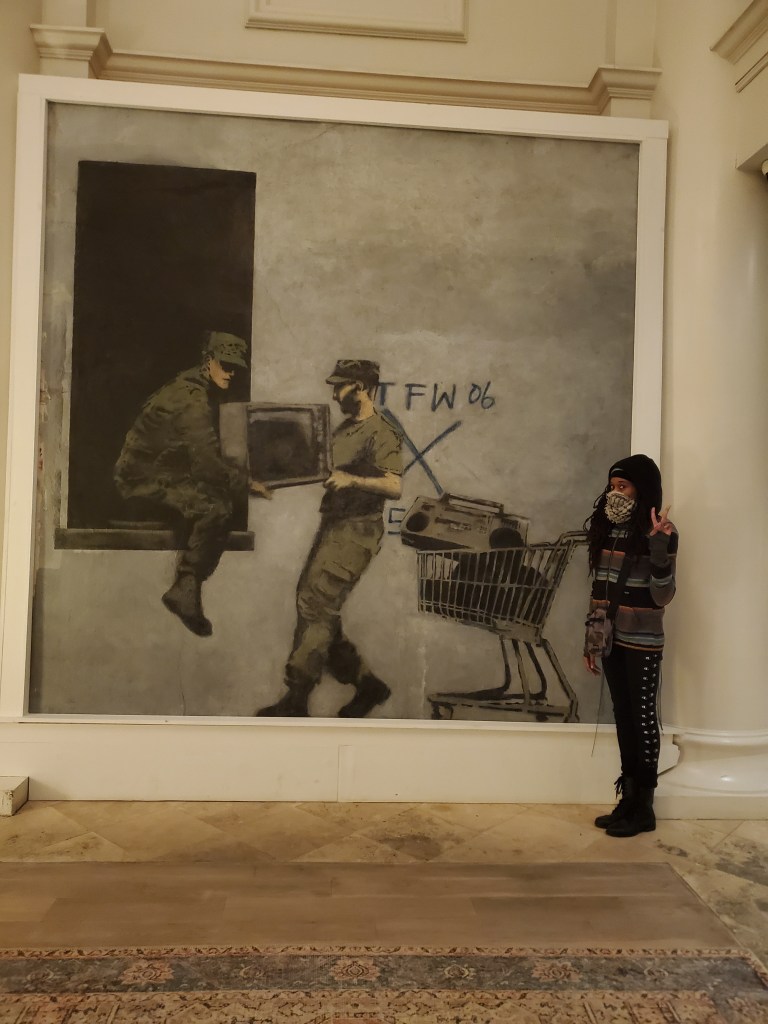 I completely stumbled upon the street art tour by accident. I hadn’t researched NOLA’s graffiti scene at all beforehand, so imagine my surprise when the tour I settled on mentioned it would end with an authentic BANKSY piece viewing (currently my favorite artist, and yes, I consider street artists, ARTISTS). I was unaware that there were even two authentic Banksy pieces in this city. “Girl With Umbrella,” is protected and maintained by the tour guides themselves (shout out to @nolaartwalk). Our guide also told us where to find the 2nd one in the city. “Looters” is housed in the lobby of the ritzy International House Hotel where they practically have a Banksy shrine room adjacent to it that you can just waltz right in to.